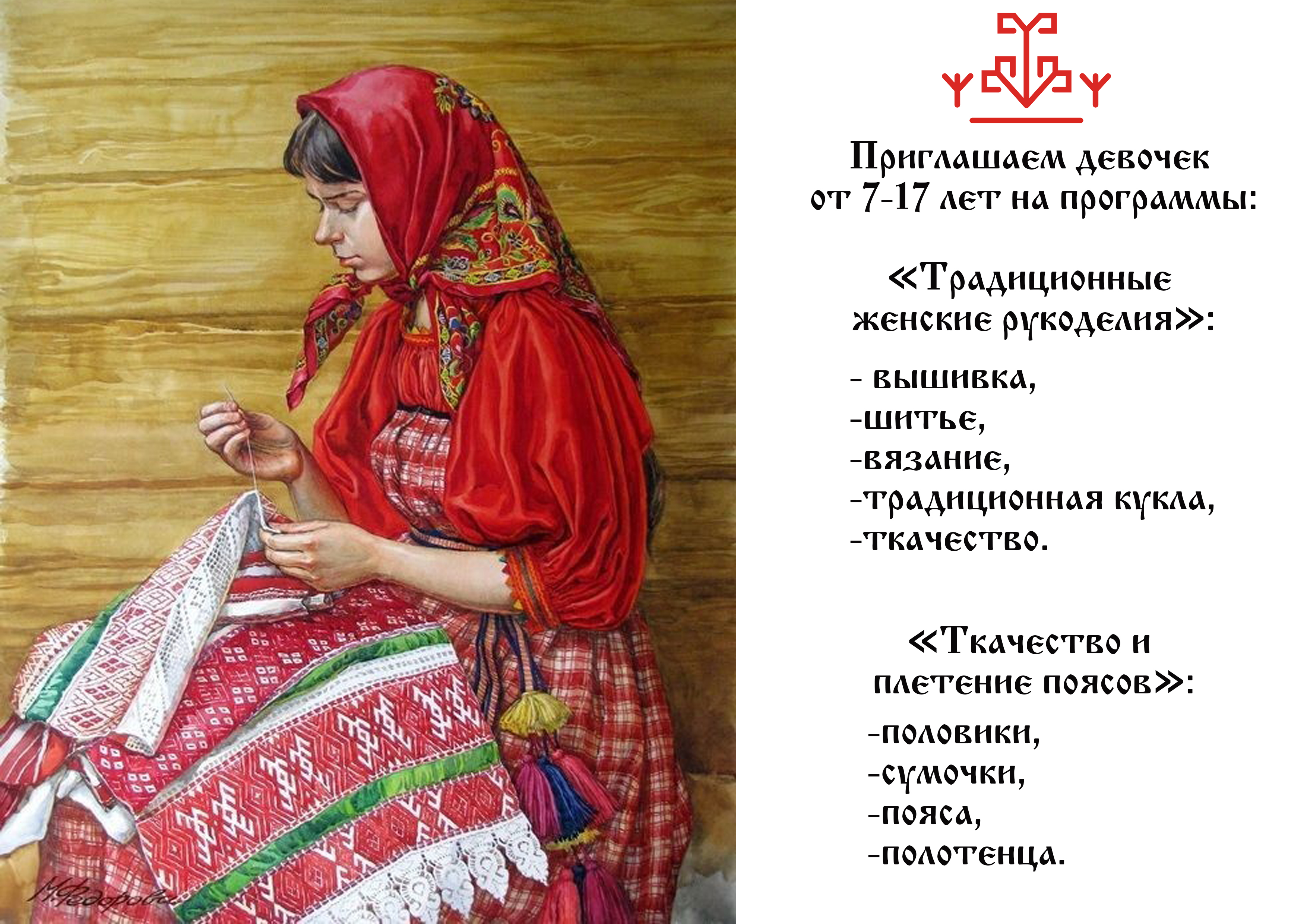В Древней Руси обязательным элементом воспитания девочек являлось рукоделие. Навыки вышивания, вязания, шитья одежды и ее украшения приобретались еще в раннем возрасте. Каждая представительница женского пола независимо от ее социального статуса (что крестьянка, что царица) должна была искусно владеть ниткой и иголкой.