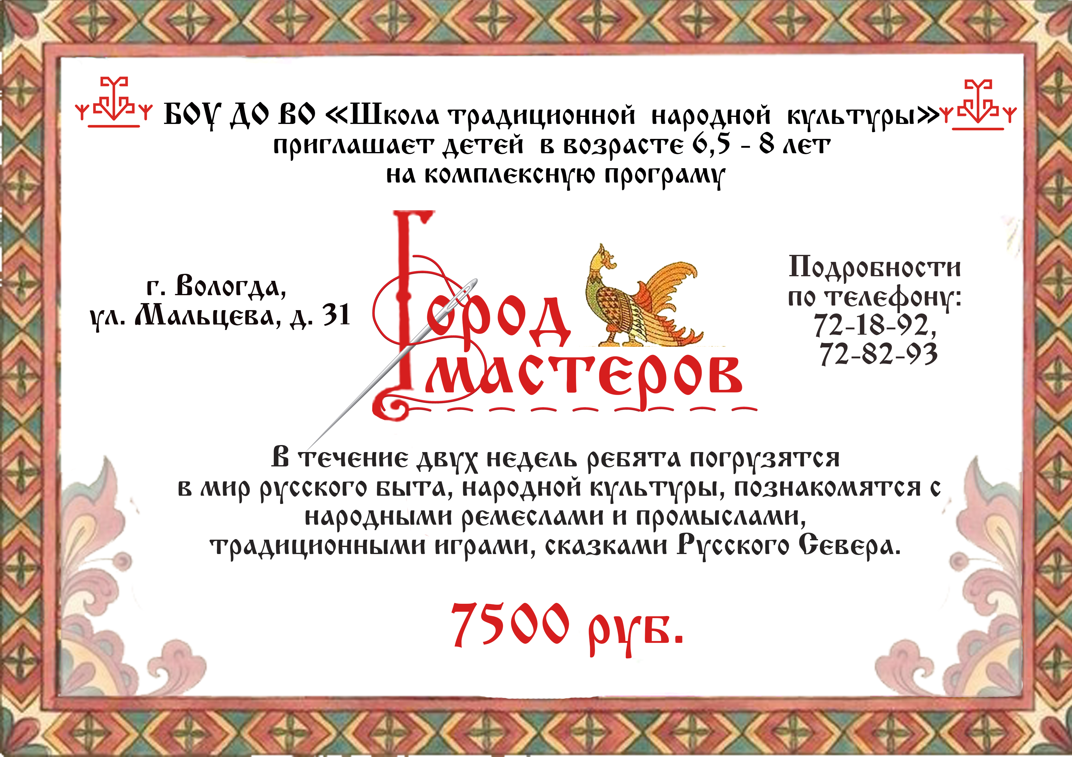 Познакомятся с ремеслами Вологодчины, окунутся в мир сказок Русского Севера, научатся играть в народные игры и многое другое!