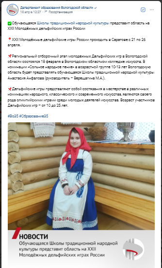21 апреля 2023 года состоялся финальный тур регионального этапа XV Областного конкурса исследовательских работ и творческих проектов по фольклору и этнографии для младших школьников «Мы-исследователи». В финальном туре регионального этапа конкурса свои исследовательские работы и проекты представили участники (в количестве 31 человек) из 14 муниципальных районов и округов Вологодской области.