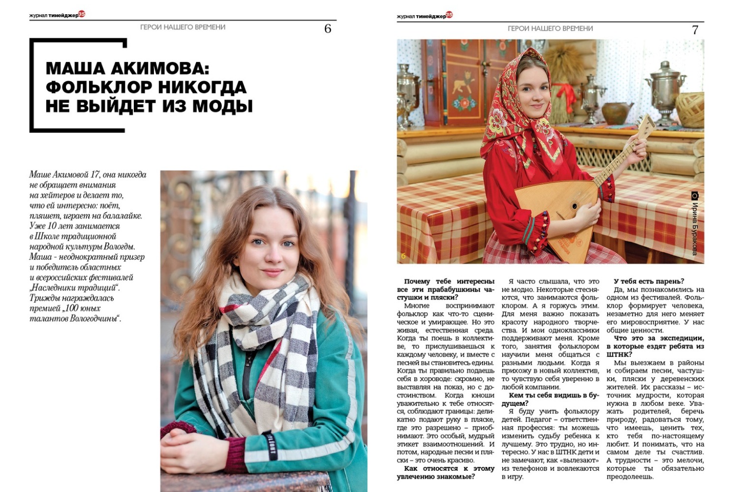 Интервью Марии Акимовой, обучающейся БОУ ДО ВО "Школа традиционной народной культуры", для журнала Тинейджер 35. Всё для подростков.