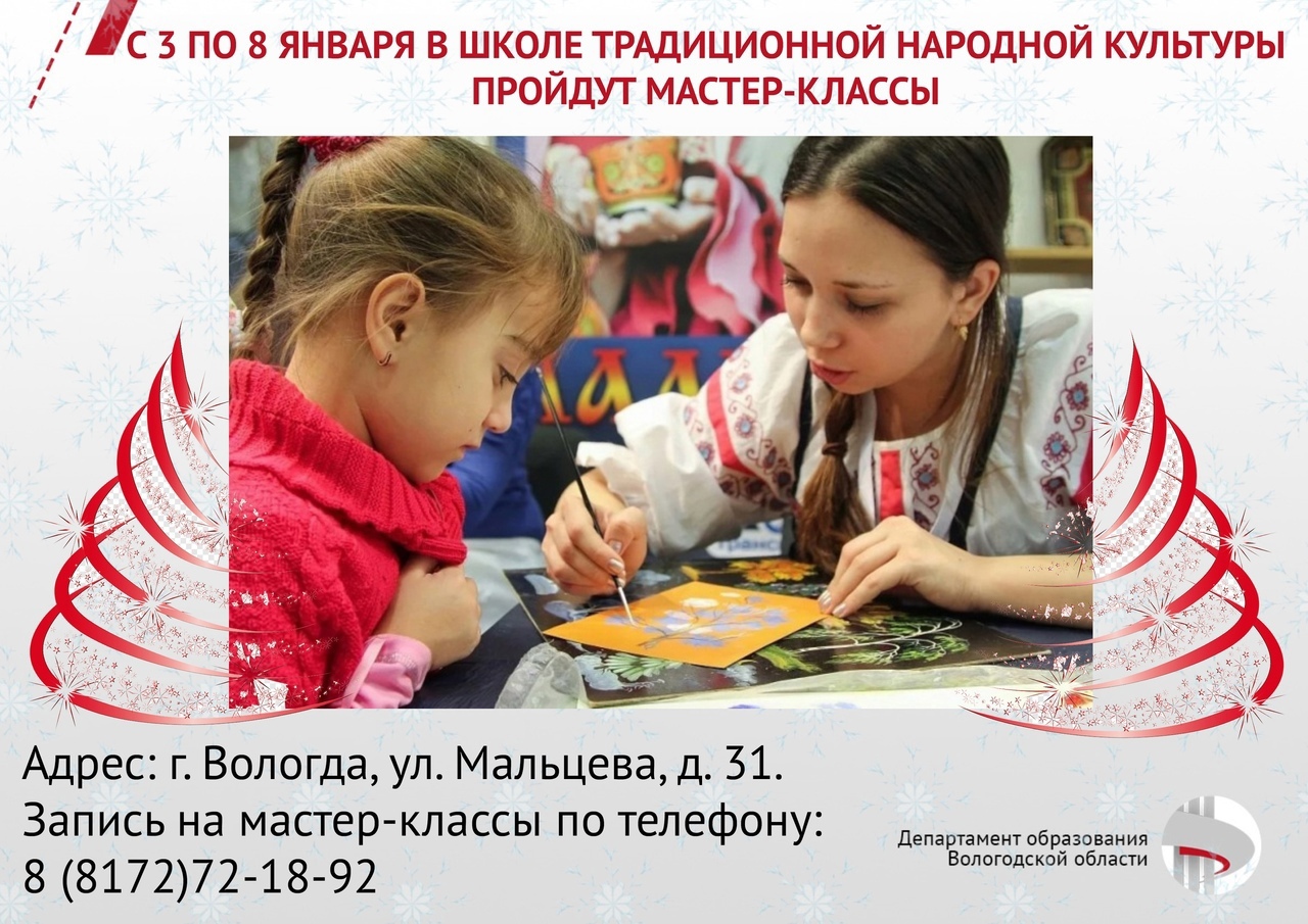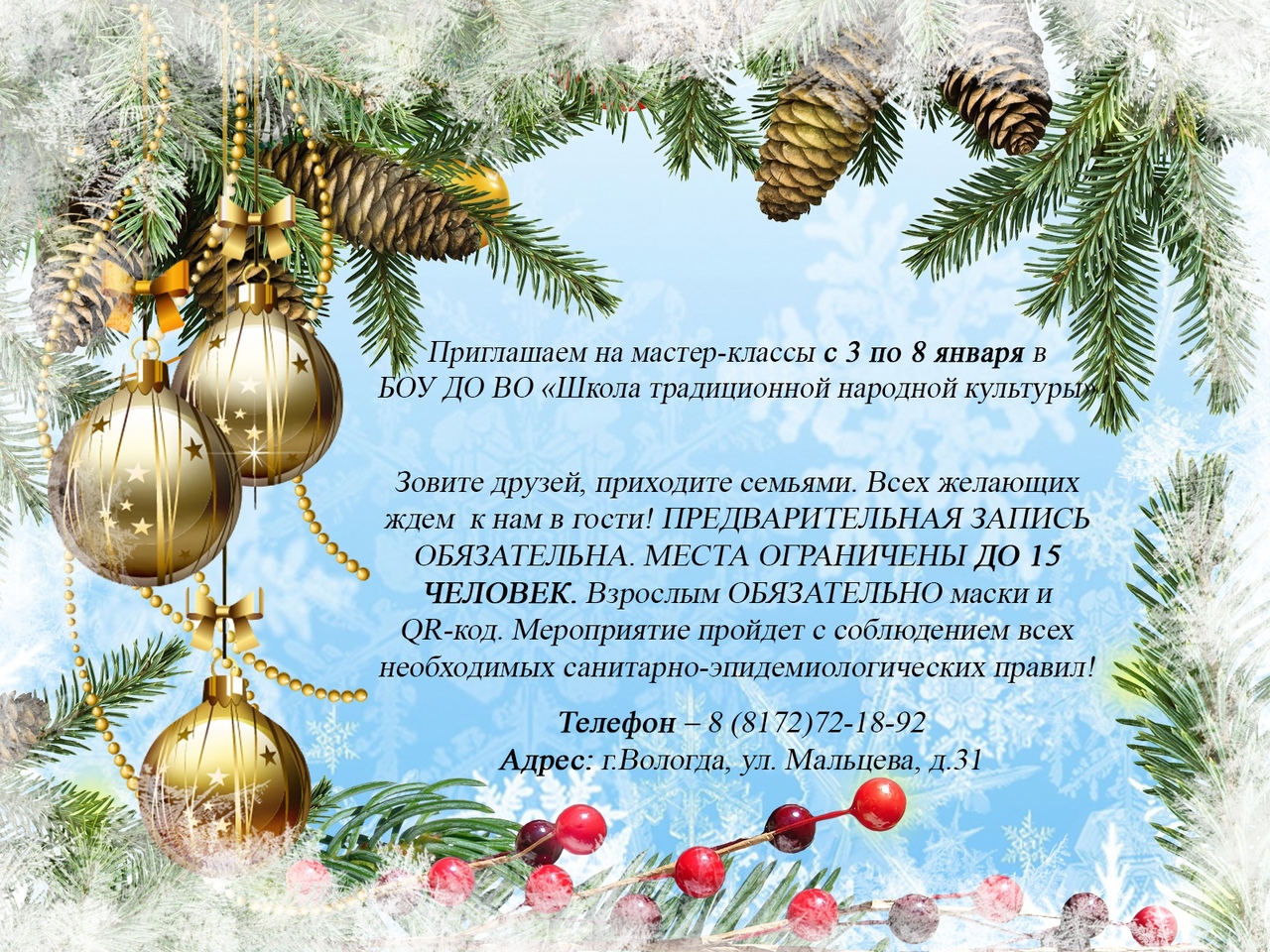 Дорогие друзья! Поздравляем Вас с наступившим новым 2022 годом! Школа традиционной народной культуры приглашает школьников и их родителей на увлекательные мастер-классы, которые пройдут с 3 по 8 января.