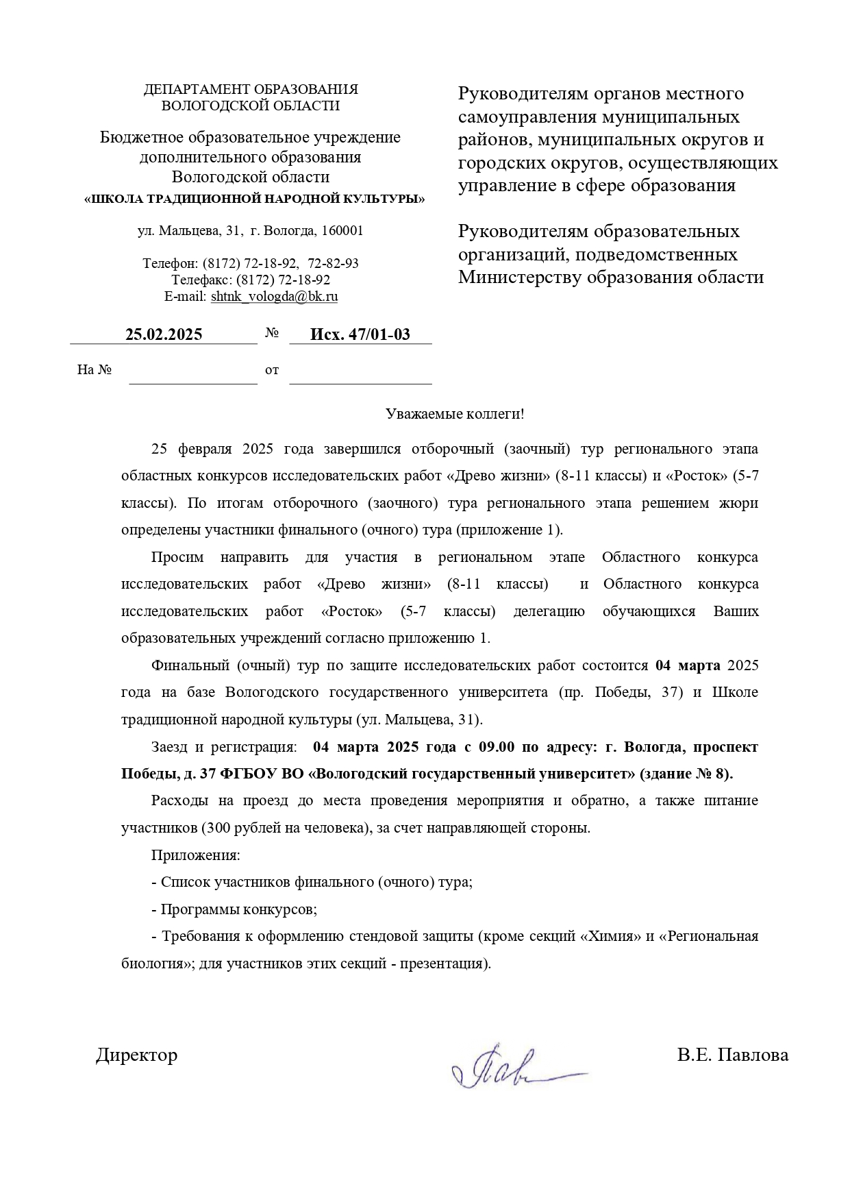 👩🏼🏫4 марта 2025 года состоялся финальный тур очных номинаций XXII Областного конкурса исследовательских работ «Росток» для 5-7 классов.👩🏼🏫4 марта 2025 года состоялся финальный тур очных номинаций XXII Областного конкурса исследовательских работ «Росток» для 5-7 классов.📝Конкурс проводится с целью развития интеллектуально-творческого потенциала детей на основе проектной и исследовательской деятельности.Конкурс является региональным этапом Всероссийского конкурса юношеских исследовательских работ «Тропой открытий В.И. Вернадского» и проводится при поддержке Общероссийского общественного Движения творческих педагогов «Исследователь».В 2025 году конкурс посвящен Году защитника Отечества. Для участников в номинации «История: человек и событие» специально была выделена подноминация «Защитники Отечества».В финальный тур конкурса (очные номинации) вышли 38 обучающихся образовательных учреждений области из 17 муниципальных округов и районов.Защита конкурсных работ финального тура в очных номинациях проходила на базе сразу 2-х учреждений: Школы традиционной народной культуры (гуманитарное направление) и Вологодского государственного университета (естественно-научное направление). В состав жюри вошли преподаватели Вологодского государственного университета, методисты Школы традиционной народной культуры, представители Совета регионального отделения Общероссийского общественно-государственного движения детей и молодежи «Движение первых» Вологодской области.Победителями стали 9 обучающихся из образовательных учреждений шести муниципальных округов и районов: Вытегорского, Вожегодского, Грязовецкого, Нюксенского, Устюженского, и г.Череповца.Победители конкурса в очных номинациях будут направлены для участия во Всероссийском конкурсе юношеских исследовательских работ «Тропой открытий В.И. Вернадского» (5-7 классы), который пройдет в апреле 2025 года в г. Москва.Более подробно с итогами защиты работ в очных номинациях конкурса можно ознакомиться в сообществе «Областной конкурс исследовательских работ «Росток» в ВК по ссылке vk.com/public210103142 .Итоги заочных номинаций Областного конкурса исследовательских работ «Росток» («Исследовательский проект», « Полевой отчет», «Реферат») будут подведены 17 марта 2025 года.