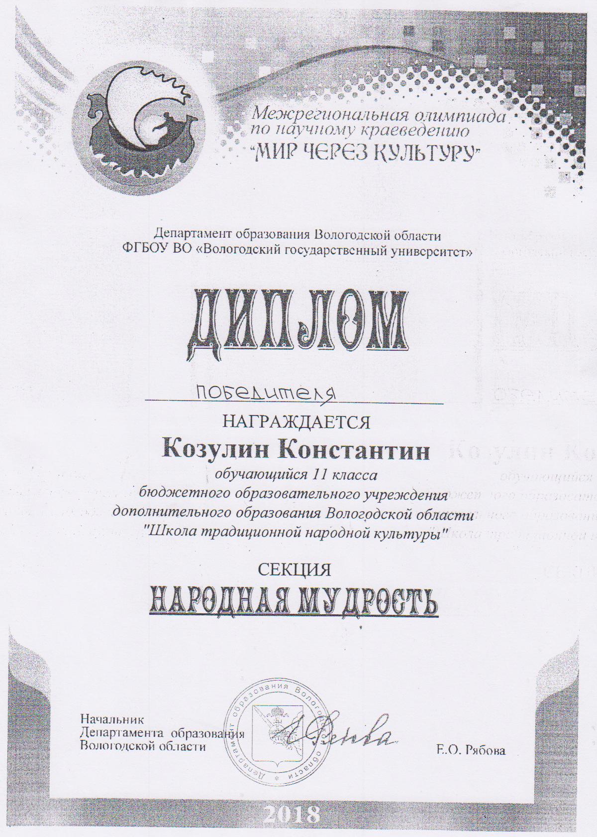 Обучающийся Школы традиционной народной культуры Константин Козулин стал победителем межрегиональной олимпиады по научному краеведению «Мир через культуру» в секции «Народная культура».