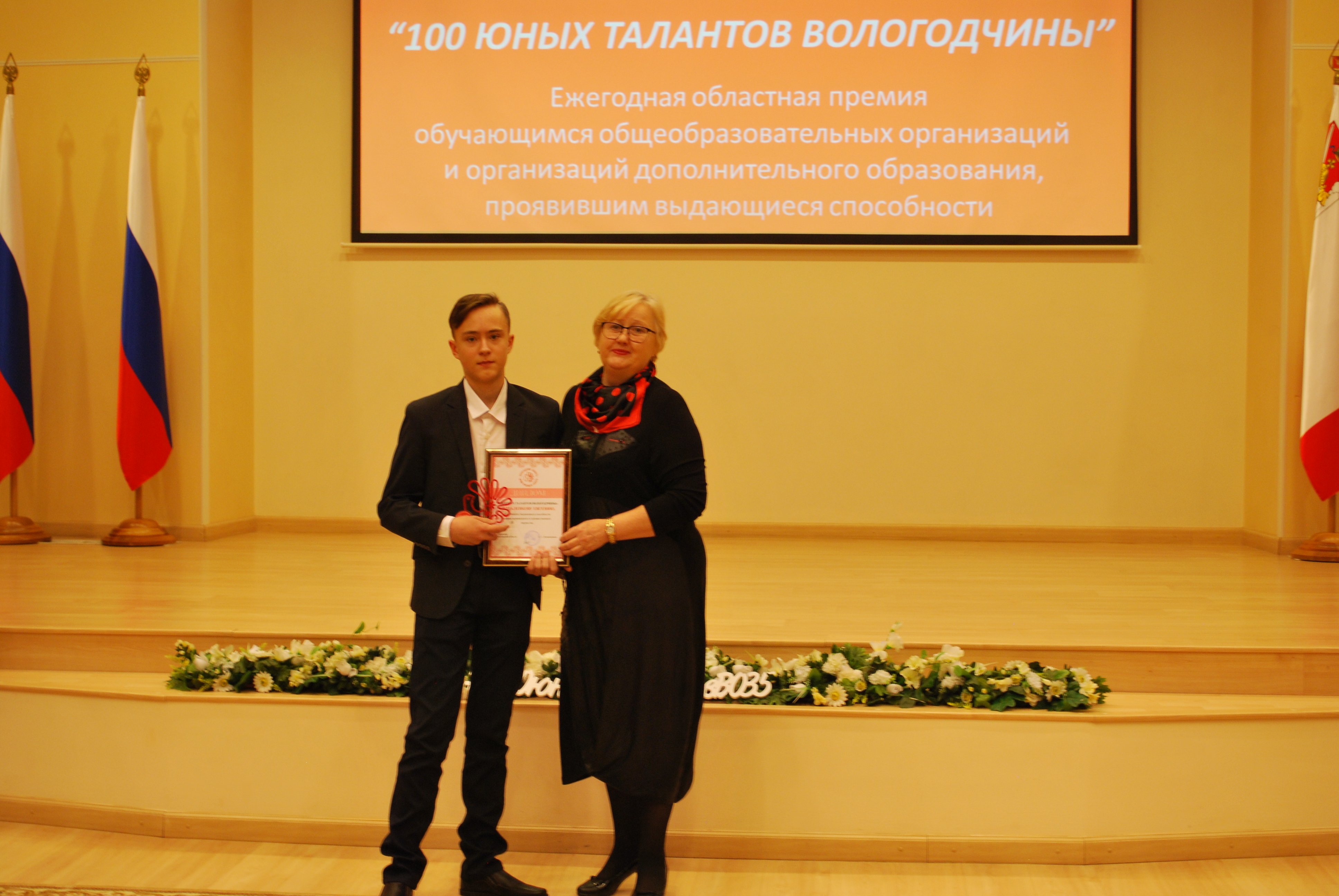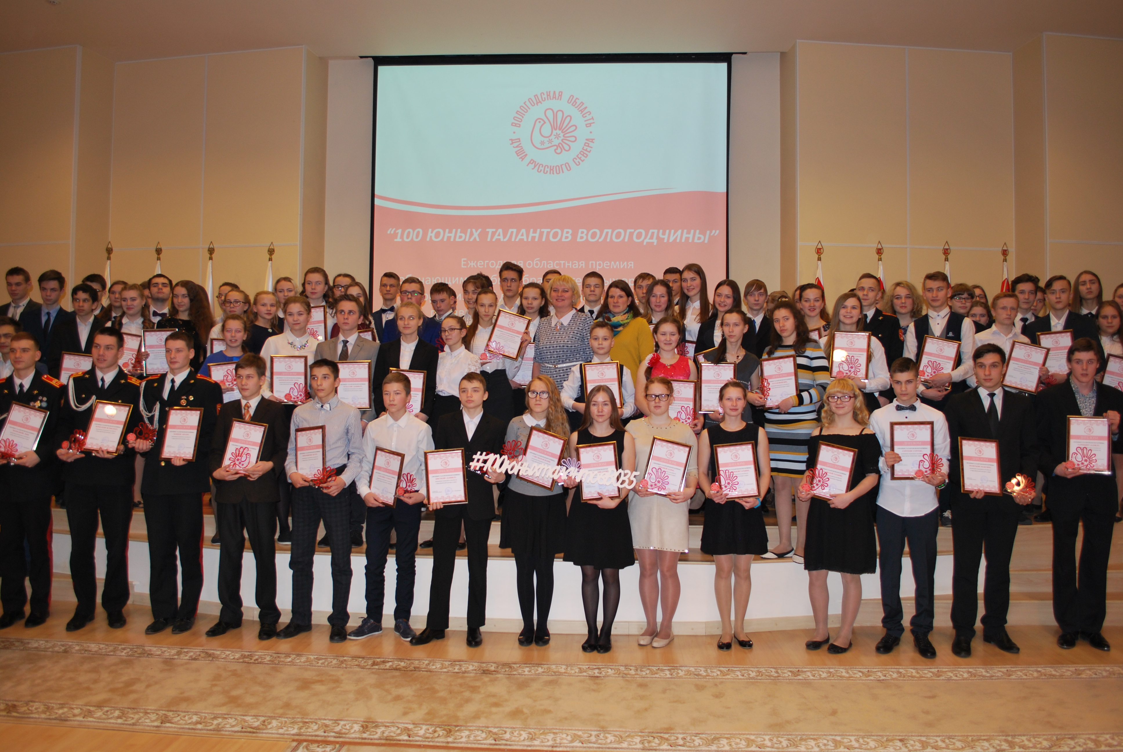 Премию «100 юных талантов Вологодчины» вручили Евгению Суздаленкову в Большом зале Правительства Вологодской области 27 декабря. Премия учреждена с целью поддержки одаренных и талантливых детей Вологодчины, направлена на стимулирование учебной, творческой и научной деятельности детей и подростков. Участников церемонии приветствовал заместитель Губернатора области Олег Александрович Васильев.