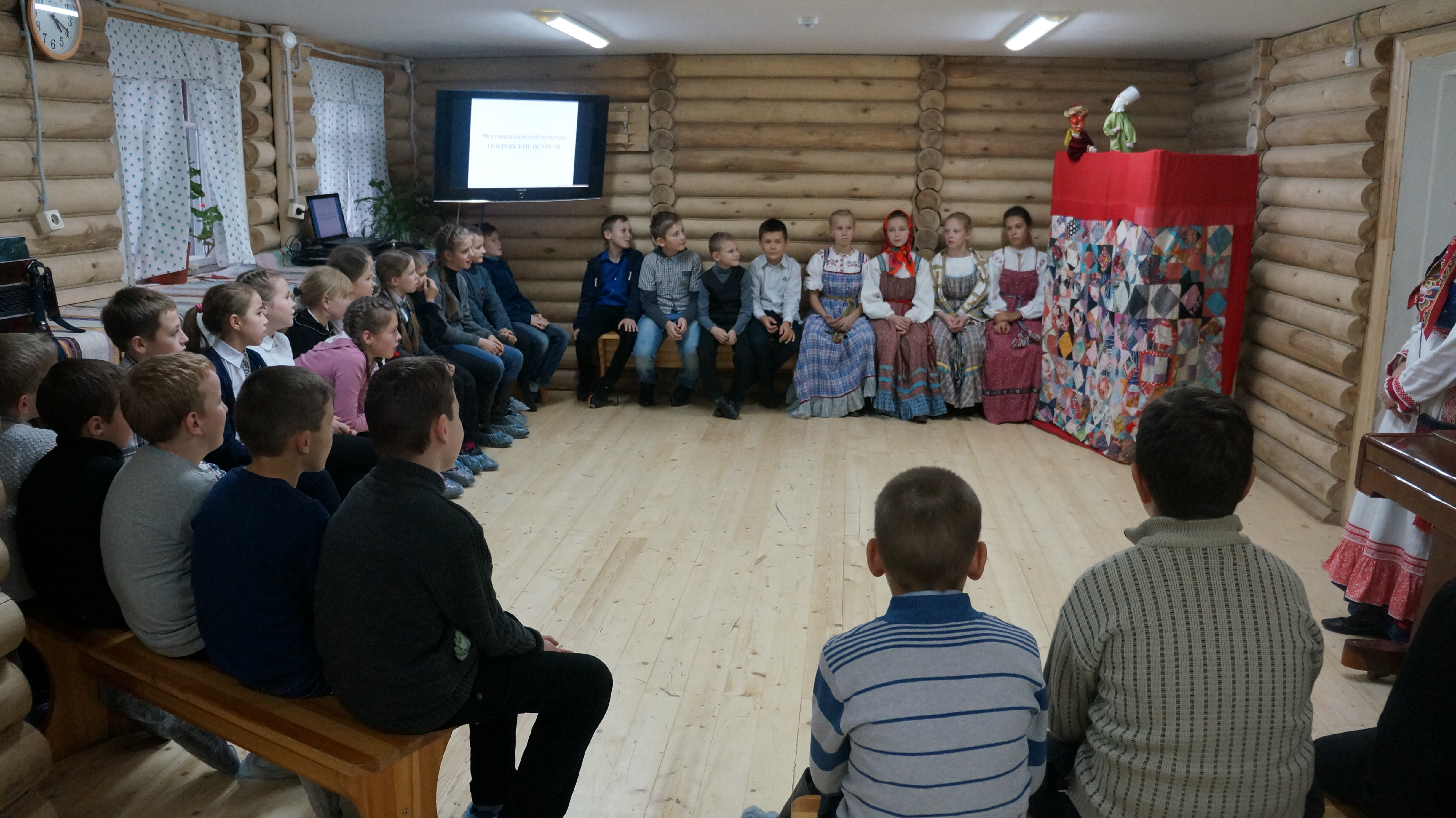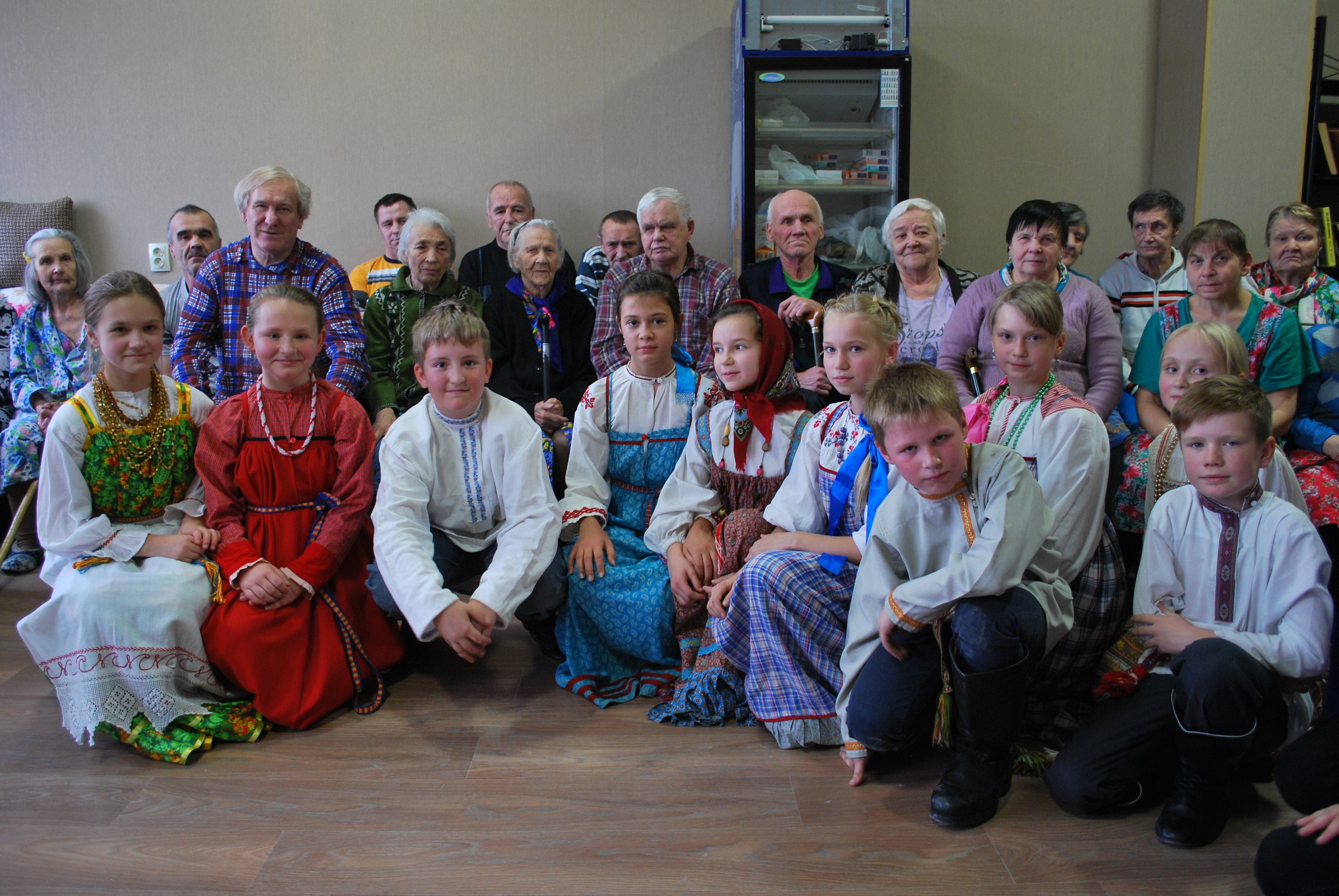 27 октября состоялся показ второго спектакля в рамках социального проекта «Фольклорный театр «Душегрея». В этот раз обучающиеся Школы традиционной народной культуры г. Вологды сами приехали в г. Грязовец и встретились со своими давними друзьями – клиентами Центра социальной адаптации. Зрители увидели кукольный спектакль «Петрушка на Покровской ярмарке». Главный персонаж - Петрушка, сидя на краю ширмы, распевал песни и веселил публику остроумными шутками. В сценке ярмарочного гуляния выступили Зоя Ивановна Нечаева и Маиса Семёновна Ромицына. В ходе спектакля зрители были включены в активное взаимодействие с юными актёрами. Наигрыш на гармошке в исполнении воспитанника Школы Льва Зубакина никого не оставил равнодушным. Пожилые люди пустились в пляс и пели частушки.