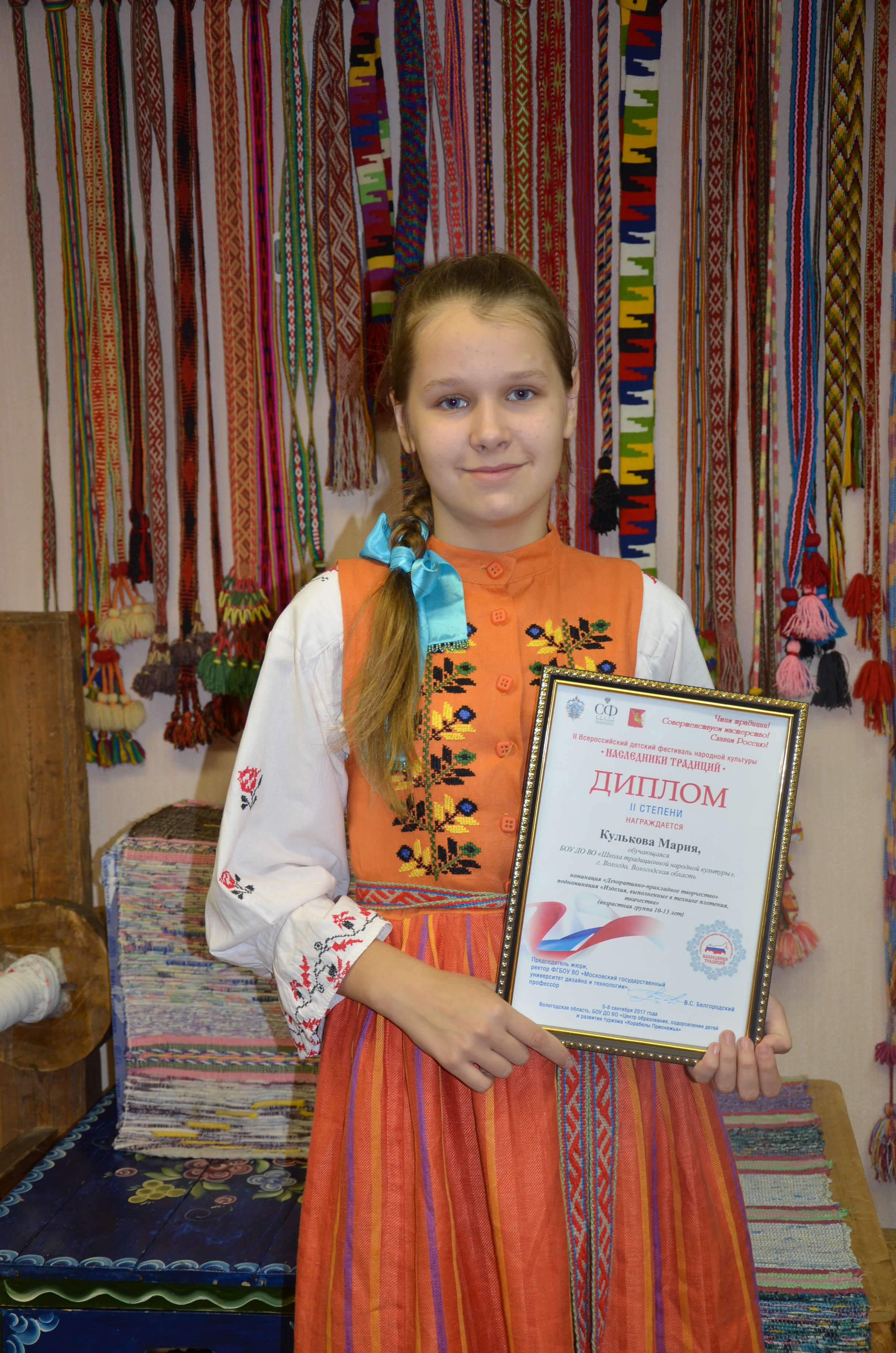Поздравляем Марию Кулькову, обучающуюся Школы традиционной народной культуры, ставшую победителем IIВсероссийского фестиваля "Наследники традиций" в номинации «Декоративно-прикладное творчество», подноминации «Изделия, выполненные в технике плетения, ткачества».